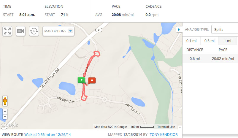 The app now tells me I went .56 miles in a little over 10 minutes. Not as far as I should go but better than sitting on my butt all day. Not only that, but the summary page includes a map of the route I took, even showing which side of the street I used and that I’m 71 feet above sea level.