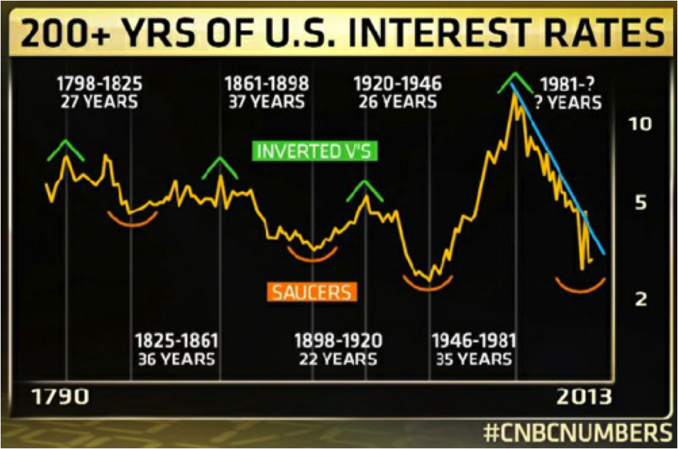 The chart at the top of this post shows interest rates in this country going back to the late 1700’s. You can expect the curve to start changing its direction soon. When that happens, you should not own many long term bonds, unless you’re happy watching your net worth decline.