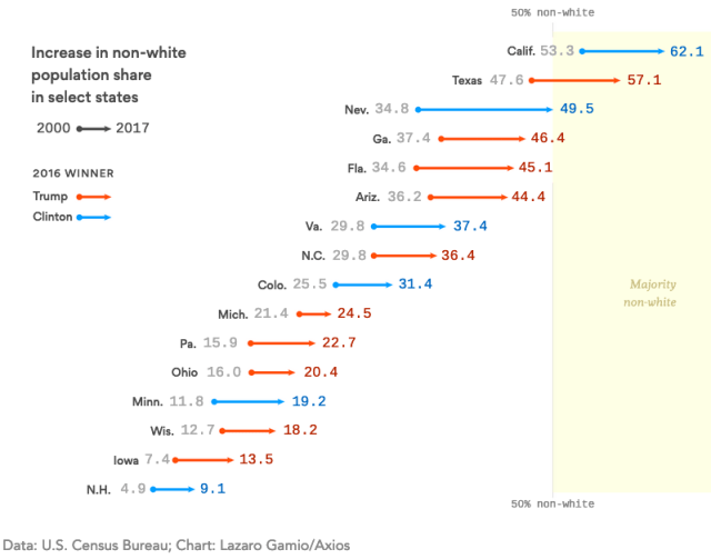 The big picture: The numbers simply do not lie. America, as a whole, and swing states, in particular, are growing more diverse, more quickly. There is no way Republicans can change birth rates or curb this trend — and there’s not a single demographic megatrend that favors Republicans.