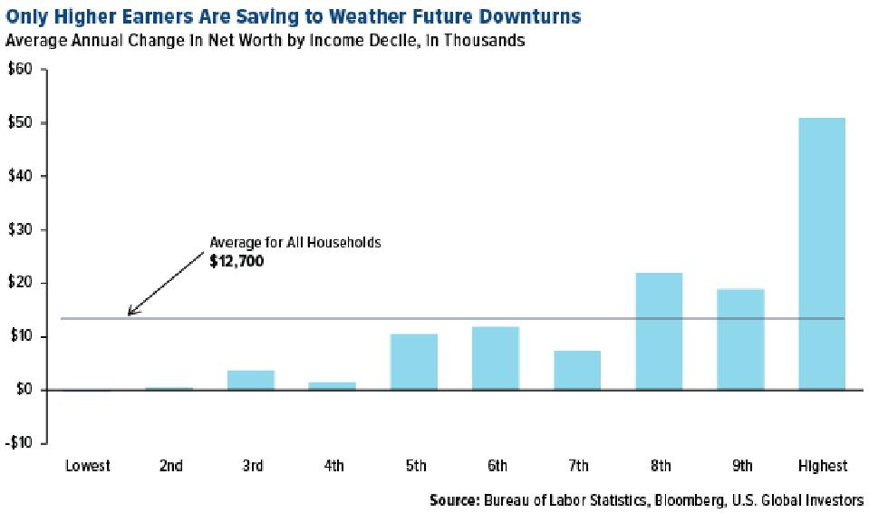 So who’s saving in America, and who isn’t? A recent report by Bloomberg’s Aaron Brown tackles this very question by breaking down U.S. households into 10 separate income brackets. Unsurprisingly, it’s the earners at the top who are able to save the most, with the very highest earners’ net worth growing an average $51,000 on an annual basis. Households in the bottom decile, meanwhile, end up losing an average $300 year-over-year, as they must borrow or sell assets to support spending. This group is most vulnerable and “will face problems in the next recession,” Brown writes, adding that “they may find it difficult to climb to financial security.”