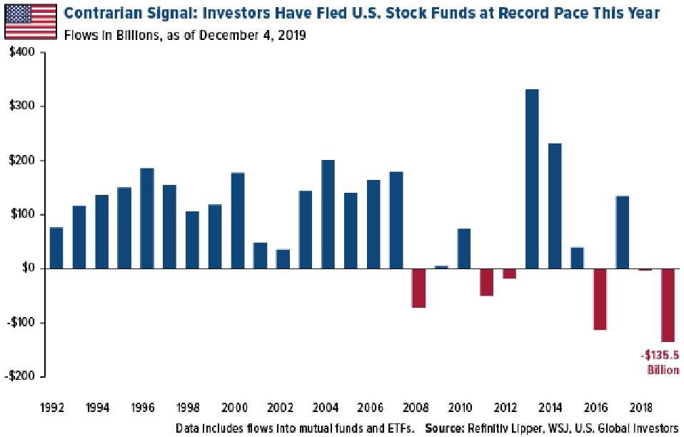 This is in line with investor behavior right now. So far this year, investors have pulled as much as $135.5 billion from U.S. equity-focused mutual funds and ETFs. That’s the biggest 12-month withdrawal on record going back to 1992, even as stocks have had a phenomenal year, increasing 26 percent.