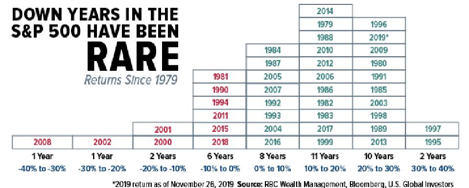 On a final note, I’d like to share with you a table that illustrates just how rare down years have been in the S&P 500. In only 10 out of the past 40 years, or 25 percent of the time, stocks ended in the red for the year, and of those instances, only four had losses greater than 10 percent. Three quarters of the time, the market was up for the year, with healthy returns of between 10 percent and 30 percent occurring about half the time.