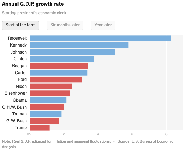But if the causes are not fully clear, the pattern is. The American economy has performed much better under Democratic administrations than Republican ones, over both the last few decades and the last century. And as Ms. Wanamaker said, “Administrations do certainly have the ability to affect economic outcomes.”