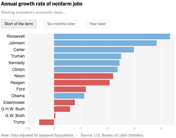 The past year has offered another case study. Mr. Trump repeatedly downplayed the coronavirus pandemic, and the country suffered. The economy would have experienced a downturn no matter who was president, but his scattered response aggravated the pandemic and the recession. In some other countries, life is much closer to normal. In the United States, Mr. Trump became the first president since Mr. Hoover to preside over a decline in employment.