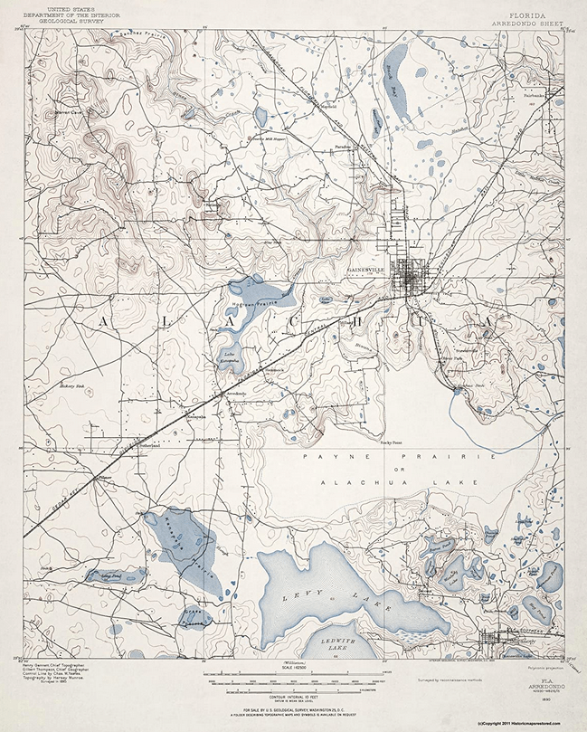 Some 50 years ago, or more, I happened to be in Mike’s Bookstore in downtown Gainesville one evening. I recall seeing a map cabinet with maps for sale. I picked one out, paid for it, and then it languished in a cardboard tube for many years. At some point I had it framed and it’s resided on my office wall for more years than I care to remember.