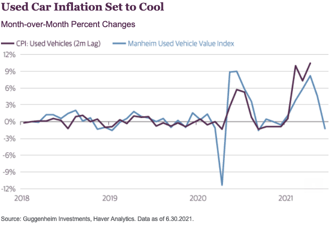 The upside surprise, while sizeable, continues to be driven by a few small categories seeing outsized price increases. 64 of the 88 basis point month-over-month increase in core CPI was due to new and used autos, car rentals, hotels, and airfare. By far the largest driver among those categories was used car prices, which grew 10.5 percent over the month and contributed 42 basis points to the month-over-month core CPI print, despite having a weight of just 4 percent in the core CPI basket. This is not the picture of widespread, runaway inflation.