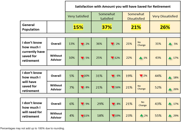 The table below displays the satisfaction with retirement savings for all investors in the study (General Population) versus those who had unanswered Fundamental Questions of Retirement Planning, further segmented by those without the help of a professional.