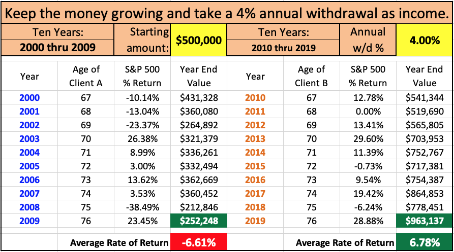 Both sides show the money invested in the S&P 500 with the 4% rule applied each year. The key to this is to understand what might happen if you transitioned from working to not working in 2000, and instead, be ten years younger and transition in 2010. The amount of money you had left ten years later is dramatically different. Which brings to mind what I said earlier about all this being a crap shoot.