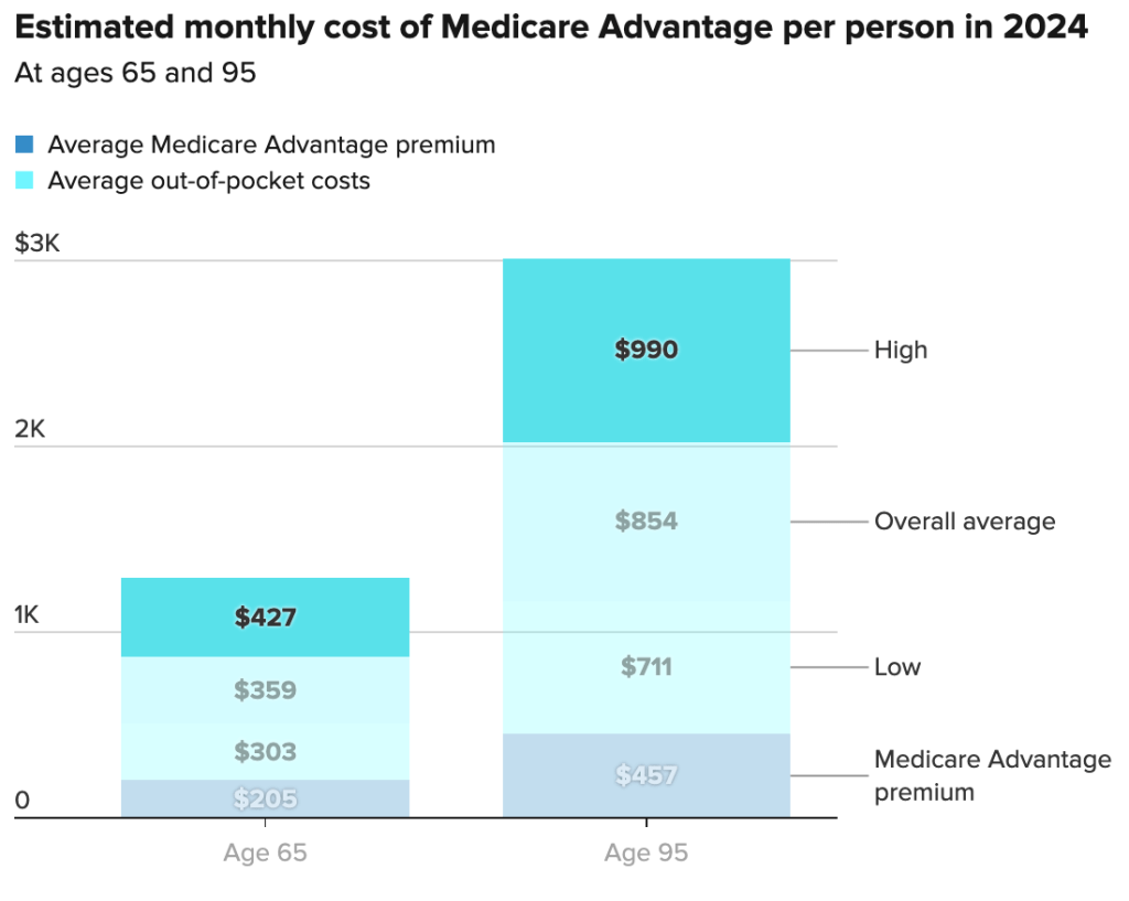 The monthly outlay for beneficiaries covered by Medicare Advantage is much lower, according to J.P. Morgan’s estimates. Someone turning 65 in 2024 may spend up to $427 per month for Medicare Advantage premiums and out-of-pocket costs. By 2054, when they are 95, that may climb to up to $990.
