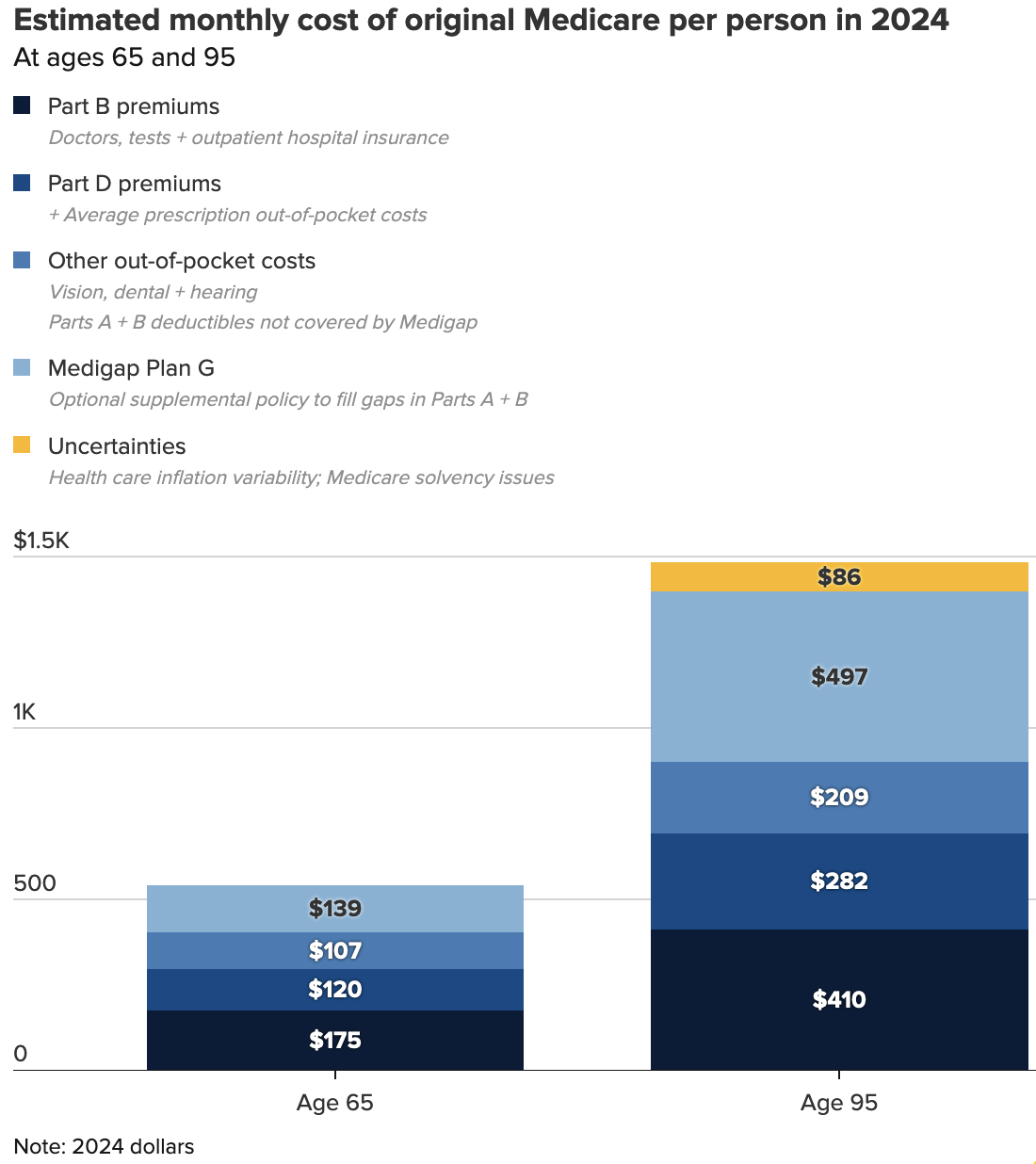 A beneficiary who is 65 in 2024 and covered by original Medicare faces $542 in monthly costs on average, according to J.P. Morgan’s research. By 2054, when that beneficiary is 95, that may go up to $1,484 per month, J.P. Morgan said.