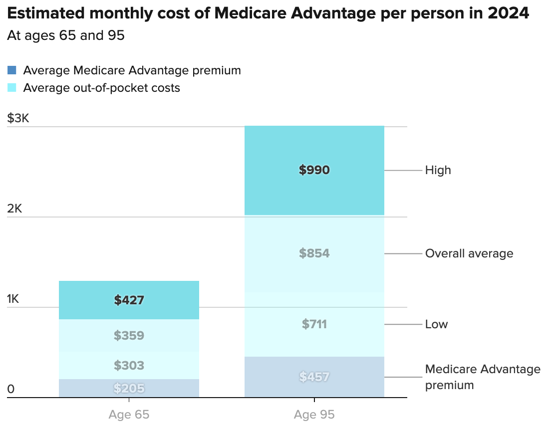 The monthly outlay for beneficiaries covered by Medicare Advantage is much lower, according to J.P. Morgan’s estimates. Someone turning 65 in 2024 may spend up to $427 per month for Medicare Advantage premiums and out-of-pocket costs. By 2054, when they are 95, that may climb to up to $990.